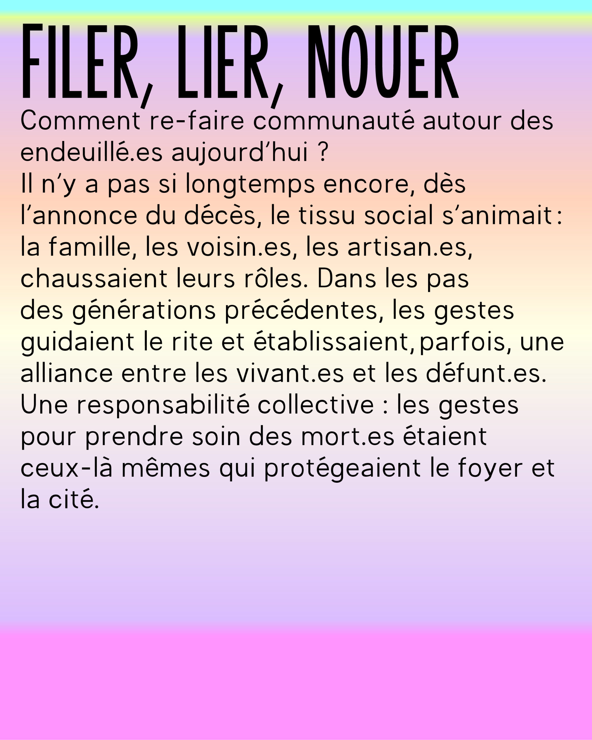 Avec Lucile Milliard, animatrice et célébrante funéraire, réalisatrice du poadcast La mort tout un art et les voix de Elie Guillou et Maryne Lanaro. Animé par Sonia Valence, conseillère funéraire et maître de cérémonie et Camille Lapouge, fossoyeuse et conseillère funéraire.